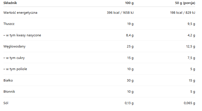 Duży plus w sprzedaży to czytelne makro na porcję 50 g: 198 kcal, 9,5 g tłuszczu (w tym 4,2 g nasyconych), 12,5 g węglowodanów (w tym 7,5 g cukrów oraz 5 g polioli), 15 g białka, 5 g błonnika, sól 0,065 g. To wartości, które warto wkleić w opis Allegro, bo klient często kupuje „liczbami”.