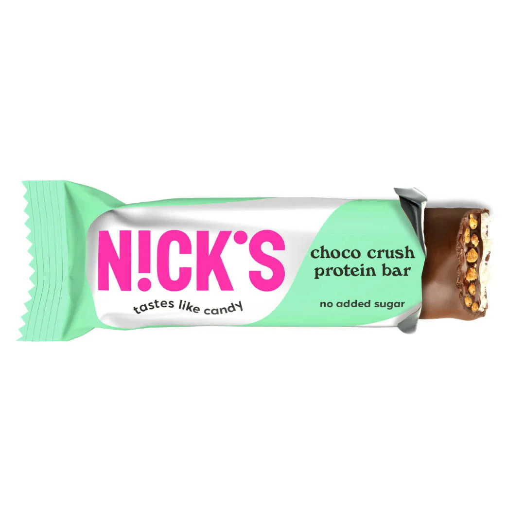 Są batony proteinowe, które smakują jak obowiązek, i są takie, które po prostu robią robotę. NICK’S Choco Crush Protein Bar 50 g zdecydowanie należy do tej drugiej grupy. To mocno czekoladowy baton z wyraźną, słono-chrupiącą nutą kukurydzianej chrupki, który daje konkretną satysfakcję przy każdym gryzie. Nie jest mdły, nie jest nijaki i nie udaje deseru — on nim po prostu jest. Dane producenta wprost wskazują intensywnie czekoladowy profil oraz słono-słodkie połączenie smaków.