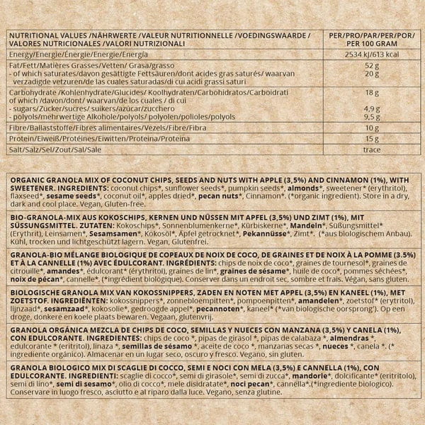 Naturalne suszone jabłka i aromatyczny cynamon tworzą soczystą, korzenną kompozycję smakową, która sprawia, że granola smakuje jak deser — ale nie ma cukru i nie przerywa ketozy.