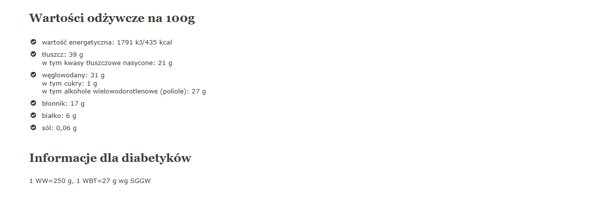 Na 100 g produkt zawiera 435 kcal, 39 g tłuszczu, 31 g węglowodanów, w tym 1 g cukrów i 27 g polioli, a także 17 g błonnika, 6 g białka i 0,06 g soli. Na karcie produktu podano również informację dla diabetyków: 1 WW = 250 g, 1 WBT = 27 g.
