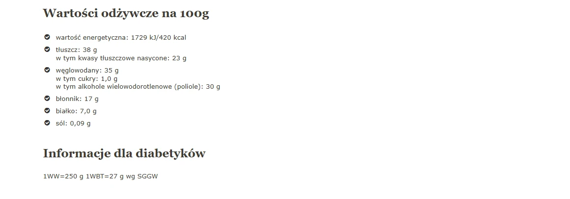 Na 100 g produkt zawiera 420 kcal, 38 g tłuszczu, 35 g węglowodanów, w tym 1 g cukrów i 30 g polioli, a także 17 g błonnika, 7 g białka i 0,09 g soli. Na karcie produktu podano też informację dla diabetyków: 1 WW = 250 g, 1 WBT = 27 g.