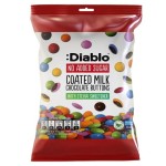Czekoladowe lentylki bez dodatku cukru Diablo 40 g to kolorowe drażetki z mlecznej czekolady pokryte chrupiącą lukrowaną polewą. Produkt został przygotowany bez dodatku tradycyjnego cukru – słodkość pochodzi z polioli oraz stewii, dzięki czemu zachowuje słodki smak przy znacznie niższej zawartości cukrów.