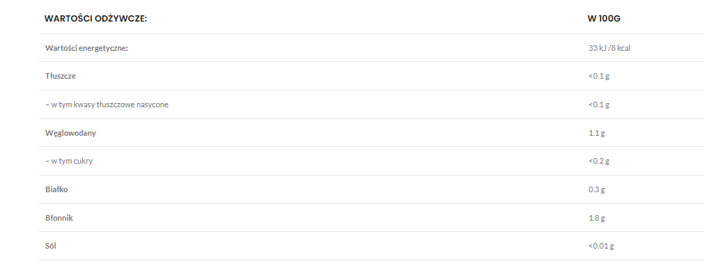 Skład jest prosty: woda, mąka z rośliny konjac oraz wodorotlenek wapnia. W opisie sklepu podkreślono też, że to produkt bezglutenowy i bez cukru.