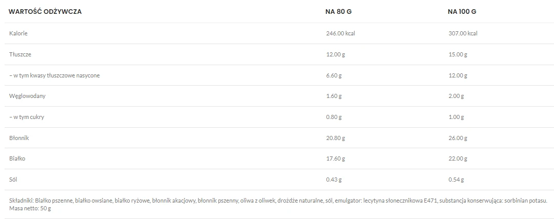 Białko pszenne, białko owsiane, białko ryżowe, błonnik akacjowy, błonnik pszenny, oliwa z oliwek, drożdże naturalne, sól, emulgator: lecytyna słonecznikowa E471, substancja konserwująca: sorbinian potasu.