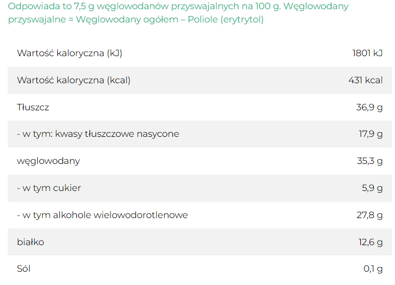Bazą granoli są orzechy, nasiona i kokos, dzięki czemu produkt dostarcza zdrowych tłuszczów i błonnika, zapewniając sytość na długo. Brak zbóż oznacza niski ładunek węglowodanów netto i stabilną energię — idealne rozwiązanie na keto-śniadanie lub przekąskę.