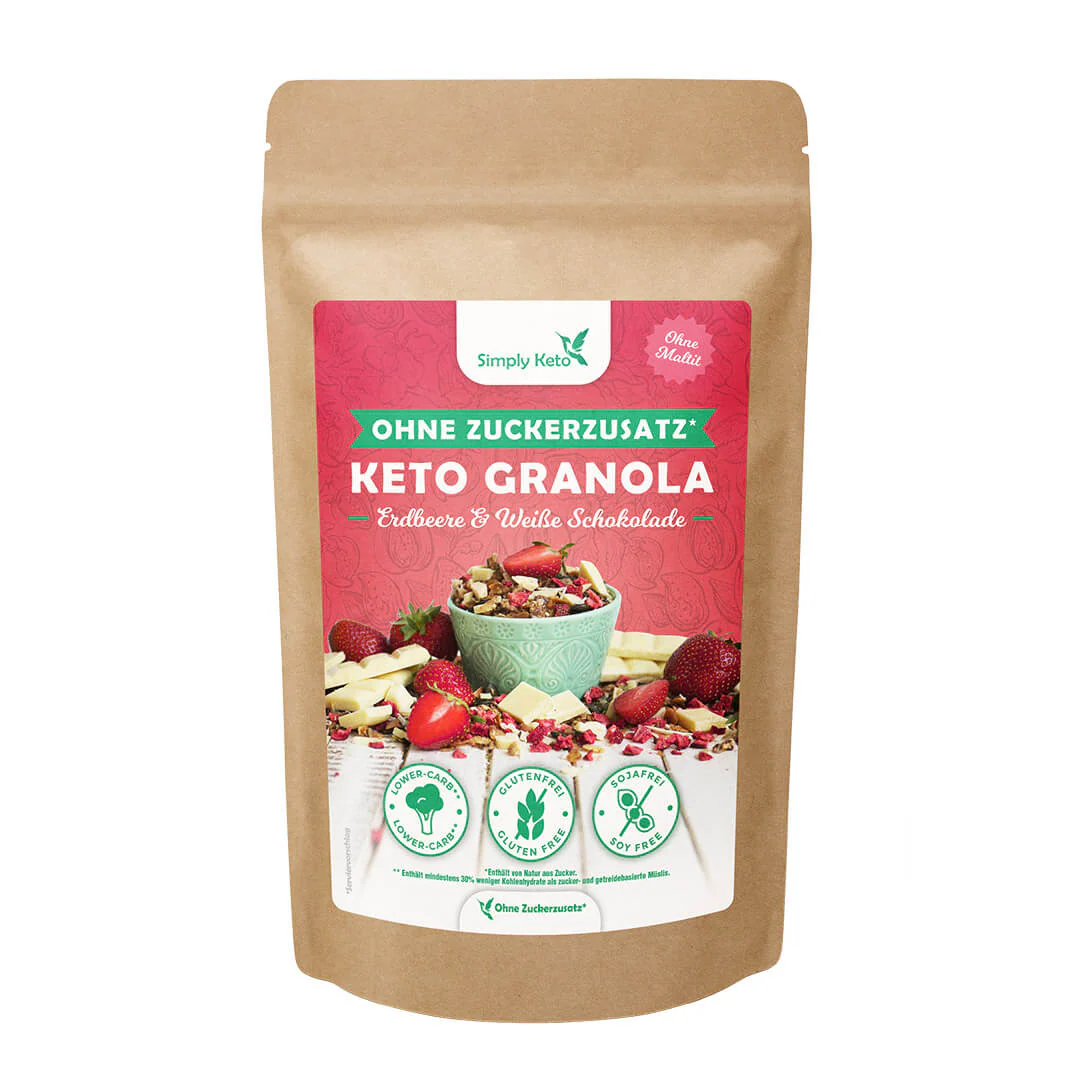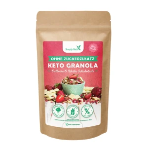 Keto Granola truskawka–biała czekolada 250 g – Simply Keto to chrupiąca, niskowęglowodanowa granola bez dodatku cukru, stworzona dla osób na diecie ketogenicznej i low carb. Łączy liofilizowane truskawki z kremową białą czekoladą bez cukru, dając wyraźny, deserowy smak bez kompromisów makro.