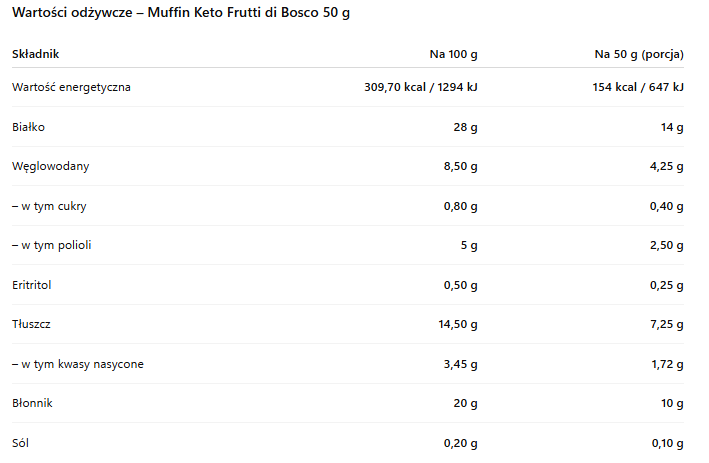 Keto Muffin z owocami leśnymi 50 g marki Pronutrition to wysokobiałkowy muffin keto z kremowym nadzieniem typu crema pasticcera o smaku owoców leśnych. To produkt stworzony dla osób na diecie ketogenicznej i low carb, które chcą zjeść coś słodkiego, ale bez klasycznego ładunku cukru i z makro dopasowanym do redukcji oraz kontroli węglowodanów. Producent wprost opisuje go jako deser idealny do diety ketogenicznej, miękki i puszysty, a jednocześnie „w stylu keto” o bardzo niskiej zawartości węglowodanów.