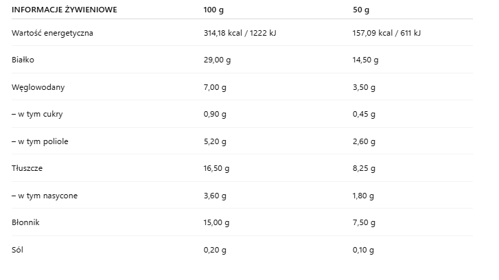 Składniki: białko pszenicy (gluten) , skrobia odporna na tapiokę, białko grochu, masło (pochodzące z mleka ), żółtko jaja , inulina, substancja słodząca: erytrytol, krem pistacjowy 3% (składniki: maltitol, koncentrat białka serwatkowego bez laktozy , pistacje 6,5%, inulina, olej z nasion słonecznika, olej kokosowy, emulgator: lecytyna sojowa , masło kakaowe, aromaty), sól, drożdże piwne, substancja konserwująca: sorbinian potasu.