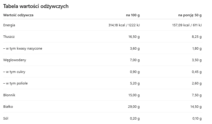 Pod względem makroskładników to produkt dobrze dopasowany do segmentu keto convenience food. W 100 g zawiera 29 g białka, 16,5 g tłuszczu, 7 g węglowodanów, 15 g błonnika i tylko 0,9 g cukrów, a jedna sztuka 50 g dostarcza 157,09 kcal. To sprawia, że rogalik może być wygodną opcją na szybkie śniadanie, przekąskę lub deser w diecie niskowęglowodanowej.