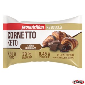 Pronutrition Cornetto Keto Cioccolato 50 g to niskowęglowodanowy rogalik z kremowym nadzieniem czekoladowym, przygotowany z myślą o osobach na diecie keto i low carb. Producent opisuje go jako rogalik ketogeniczny bez cukru, o smaku i strukturze zbliżonej do klasycznego rogalika, ale z wyraźnie niższą zawartością węglowodanów i cukrów.