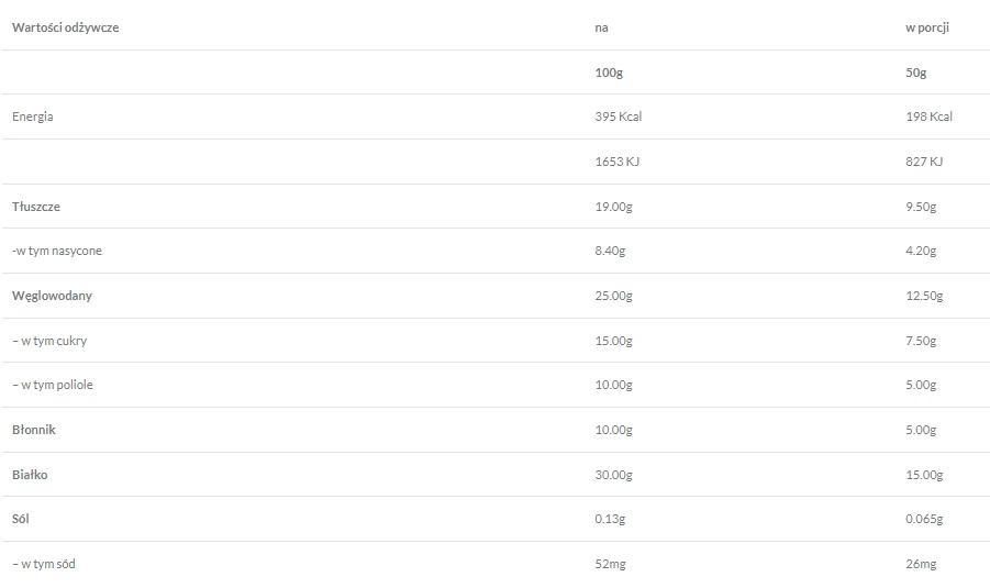W jednej paczce znajduje się 50 g produktu, a wartości odżywcze wskazują na 198 kcal w porcji, 15 g białka, 9,5 g tłuszczu oraz 12,5 g węglowodanów, w tym 7,5 g cukrów i 5 g polioli. To przekąska, która dobrze sprawdzi się jako dodatek do kawy lub herbaty, a także jako wygodna opcja do pracy, samochodu lub lunchboxa.