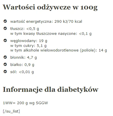 Na 100 g produkt zawiera 70 kcal, mniej niż 0,5 g tłuszczu, 19 g węglowodanów, w tym 5,1 g cukrów i 14 g polioli, a także 4,7 g błonnika, 0,9 g białka oraz mniej niż 0,01 g soli. Na karcie produktu podano również informację dla diabetyków: 1 WW = 200 g.