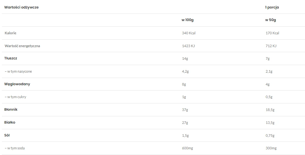 Największą zaletą tych krakersów jest profil makro. W 100 g produktu znajduje się 8 g węglowodanów, 27 g białka i aż 37 g błonnika. W całym opakowaniu 50 g oznacza to 4 g węglowodanów, 13,5 g białka i 18,5 g błonnika. To bardzo dobry wybór dla klientów, którzy szukają keto przekąski do pracy, samochodu, torby czy lunchboxa, bez przypadkowego ładowania się w zwykłe mączne chrupacze. Wartość energetyczna wynosi 340 kcal w 100 g i 170 kcal w porcji 50 g.