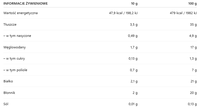 Składniki:Olej z nasion słonecznika, białka mleka Mpc , polidekstroza, erytrytol, substancje słodzące: erytrytol, sukraloza; tłuszcz roślinny (utwardzony palmowy), emulgator: lecytyna sojowa .