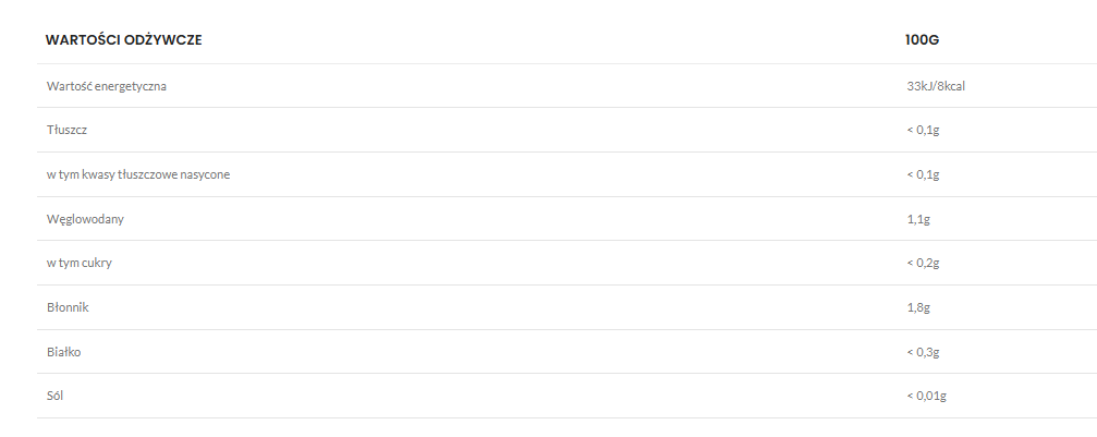 bardzo niska kaloryczność: 8 kcal / 100 g,
