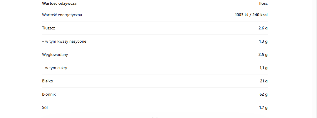 Wartości odżywcze w 100 g produktu (z karty producenta):