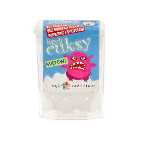 Cuksy miętowe to malutkie, bezcukrowe cukierki o intensywnym smaku mięty, słodzone naturalnym ksylitolem zamiast tradycyjnego cukru. W składzie 98 % stanowi ksylitol – substancja słodząca, a dodatkowo obecny jest naturalny aromat miętowy i bezwonny olej kokosowy, dzięki czemu cukierki są aromatyczne, a jednocześnie łagodne i przyjemne w konsumpcji.
