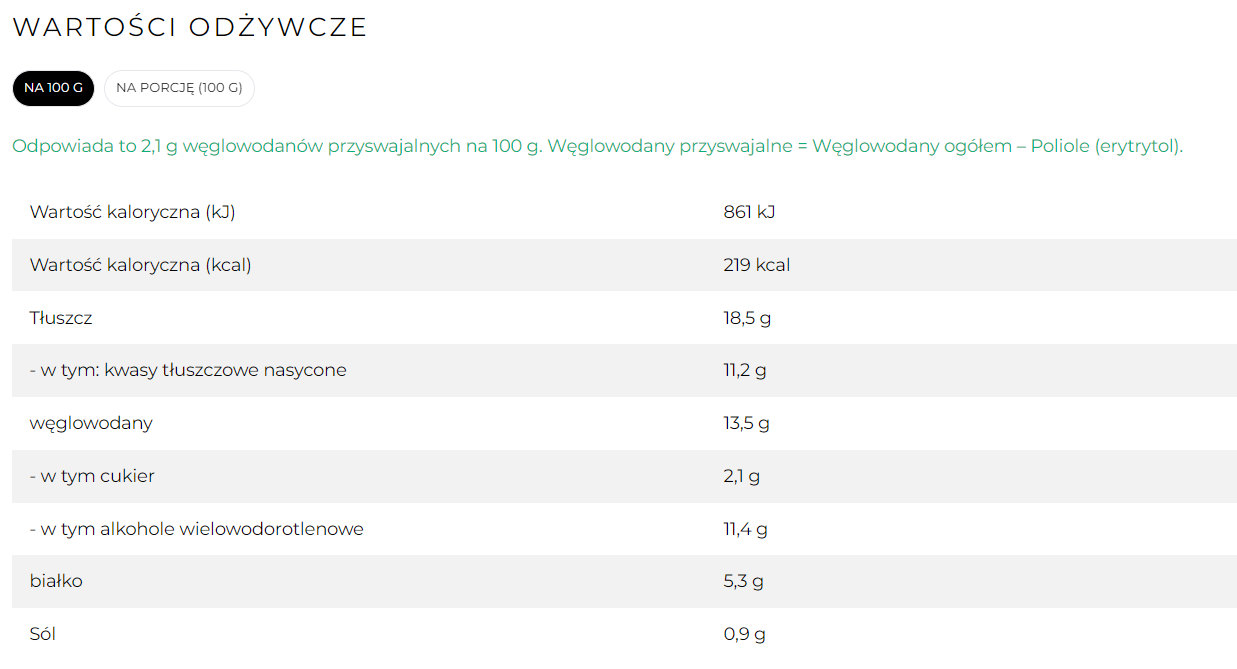 Gotowy deser ma około 2,1 g węglowodanów netto na 100 g, co czyni go odpowiednim do diety keto.