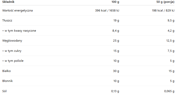 Makro w porcji jest czytelne i mocno sprzedażowe: w 50 g masz 198 kcal, 9,5 g tłuszczu (w tym 4,2 g nasyconych), 12,5 g węglowodanów (w tym 7,5 g cukrów i 5 g polioli), 15 g białka, 5 g błonnika oraz 0,065 g soli. Dzięki wysokiej zawartości białka te ciasteczka są bardziej sycące niż typowe słodycze.
