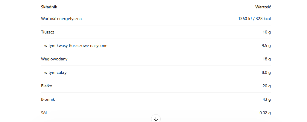 W 100 g produktu znajdziesz aż 43 g błonnika i 20 g białka, przy 18 g węglowodanów. Dzięki temu mąka kokosowa BIO 1 kg sprawdza się nie tylko jako zamiennik tradycyjnej mąki, ale też jako składnik, który poprawia sytość i strukturę posiłków. To produkt bardzo uniwersalny — możesz używać go zarówno do wypieków, jak i do zagęszczania mas, kremów czy panierowania.