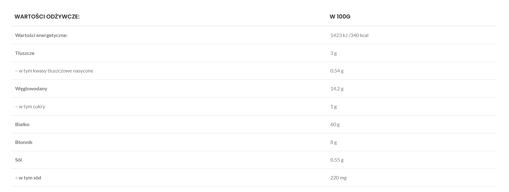 Ten niskowęglowodanowy makaron Noodle bazuje na składnikach takich jak gluten pszenny, izolowane białko roślinne i białka jajkowe, co przekłada się na solidną porcję białka (60 g na 100 g) i jednocześnie niską zawartość cukru. Zawiera także błonnik, który wspiera uczucie sytości i prawidłową pracę układu pokarmowego.