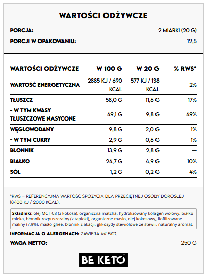Napój dostarcza zdrowych tłuszczów z MCT, które są szybko przekształcane w energię, wspiera syntezę kolagenu w organizmie dzięki hydrolizatowi kolagenowemu oraz dostarcza antyoksydantów z matchy (EGCG) i naturalnej malinowej nuty. To propozycja na kremowe latte bez dodatku cukru i z niską ilością węglowodanów.