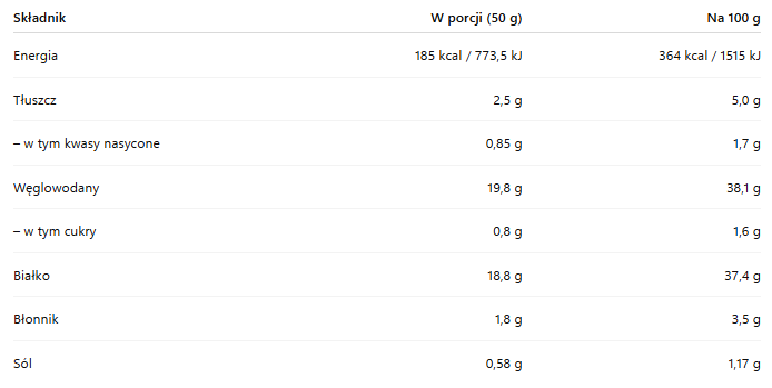 Najważniejsze wartości odżywcze wyglądają konkretnie: na 100 g to 364 kcal, 37,4 g białka, 38,1 g węglowodanów (w tym 1,6 g cukrów), 5 g tłuszczu, 3,5 g błonnika i 1,17 g soli. Na porcję 50 g (ok. 3 pancake’i): 185 kcal, 18,8 g białka, 19,8 g węglowodanów, 0,8 g cukrów, 2,5 g tłuszczu i 0,58 g soli.