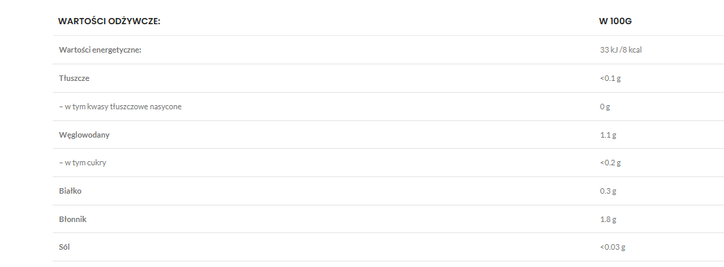 • Tłuszcz: <0,1 g (w tym nasycone 0 g)