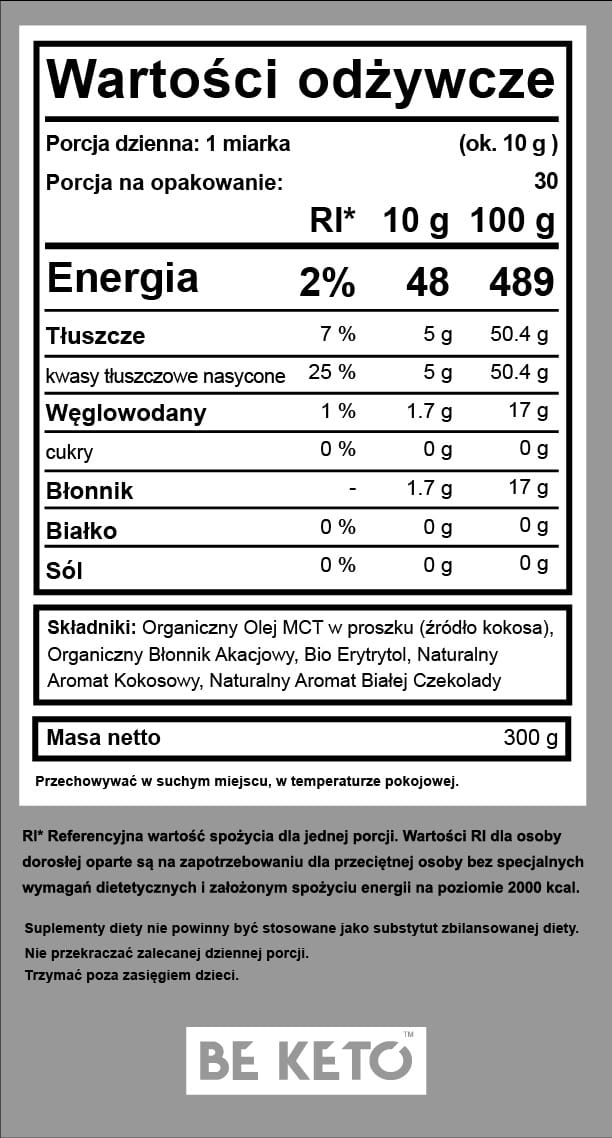 Olej MCT w Proszku - Kokos & Biała Czekolada 300g Be Keto