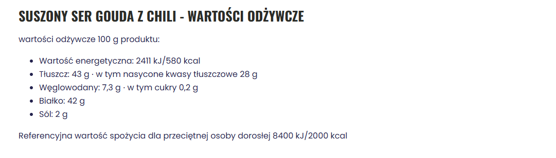 Skład i alergeny: ser z ostrą papryką chili suszony próżniowo (mleko pasteryzowane, sól, stabilizator: chlorek wapnia, kultury bakterii) + 2% ostra papryka chili. Alergen: mleko. Pochodzenie: Polska. Termin ważności: rok od daty produkcji.