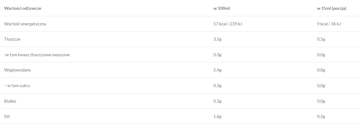 Zero cukru i bardzo niska wartość energetyczna — ok. 9 kcal na porcję 15 ml.