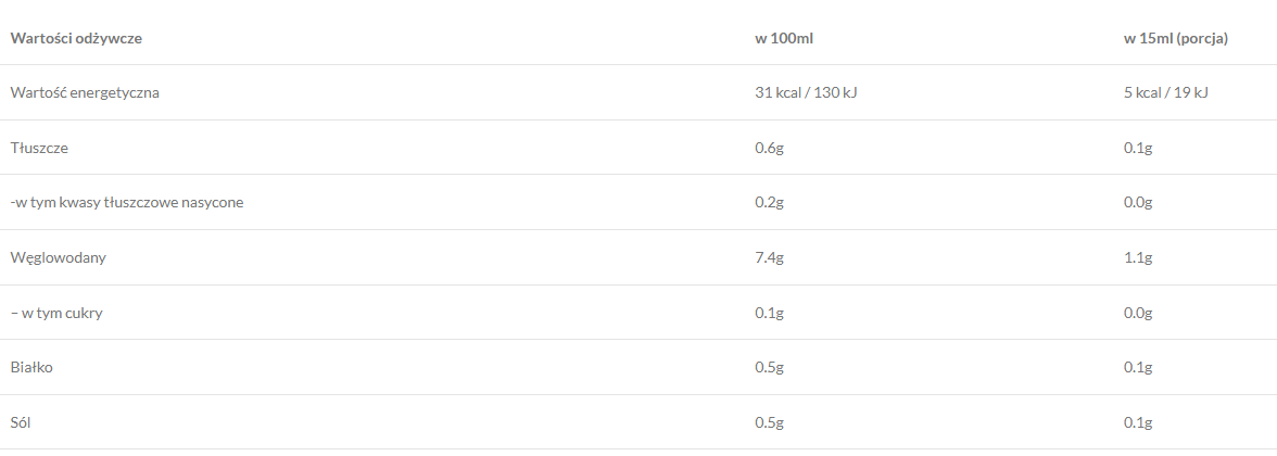 Niskokaloryczny — ok. 31 kcal/100 g (porcja 15 ml to ~5 kcal).