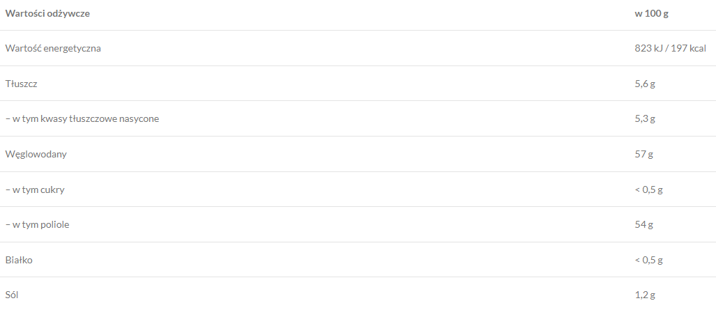 Produkt nie zawiera dodatku cukru, dzięki czemu świetnie wpisuje się w dietę ketogeniczną, low-carb oraz plany redukcyjne i diabetyczne.