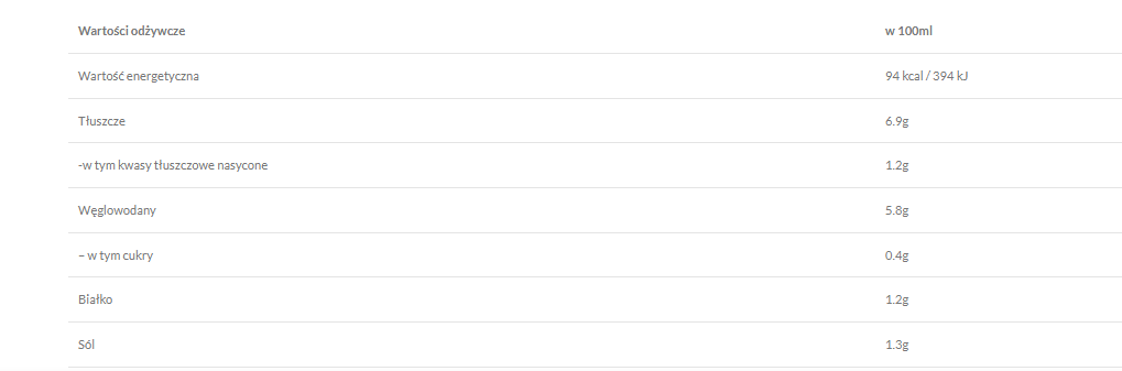 W porcji 15 ml sos dostarcza około 14 kcal, a w 100 g około 93 kcal, dzięki czemu łatwiej kontrolować bilans energetyczny posiłku. W porównaniu do tradycyjnych sosów serowych to dużo lżejsza opcja do codziennej kuchni — bez rezygnacji z intensywnego, wytrawnego smaku.