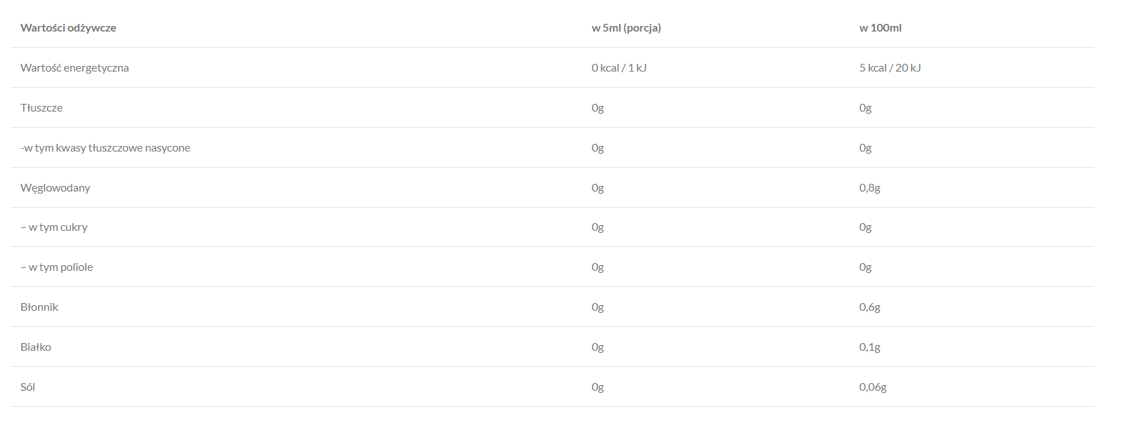 Produkt nie zawiera cukru ani tłuszczu, a typowa porcja dostarcza 0 kcal, dzięki czemu świetnie sprawdza się podczas redukcji masy ciała oraz w codziennym jadłospisie osób dbających o sylwetkę. Syrop jest keto-friendly, wegański i bez oleju palmowego, co czyni go uniwersalnym wyborem również dla osób na dietach roślinnych.