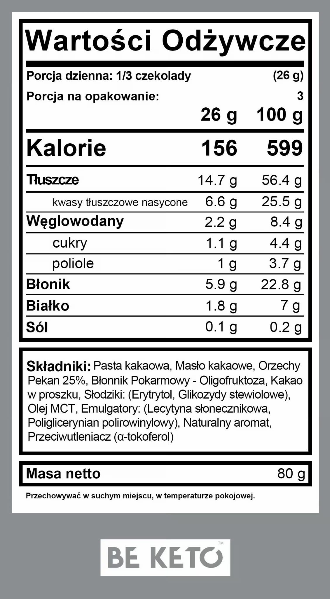 Nie czekaj na lepszy moment! Zafunduj sobie lub bliskim chwile prawdziwej przyjemności z Wegańską Keto Czekoladą z Olejem MCT - Orzech Pekan. Idealna jako przekąska w pracy, po treningu lub po prostu na poprawę humoru. Korzystaj z jej dobroczynnych właściwości i ciesz się smakiem, który zachwyca!